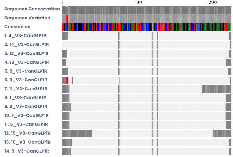 Sanger Sequencing which was performed by an external lab revealed the exact nucleotide sequence in each sample. After that I used DNA Subway to trim low-quality bases, review chromatograms, pair forward and reverse reads into consensus sequences, and then BLAST and MUSCLE-align those sequences to confirm they matched the canine GLP1R gene and targeted the regions I intended.